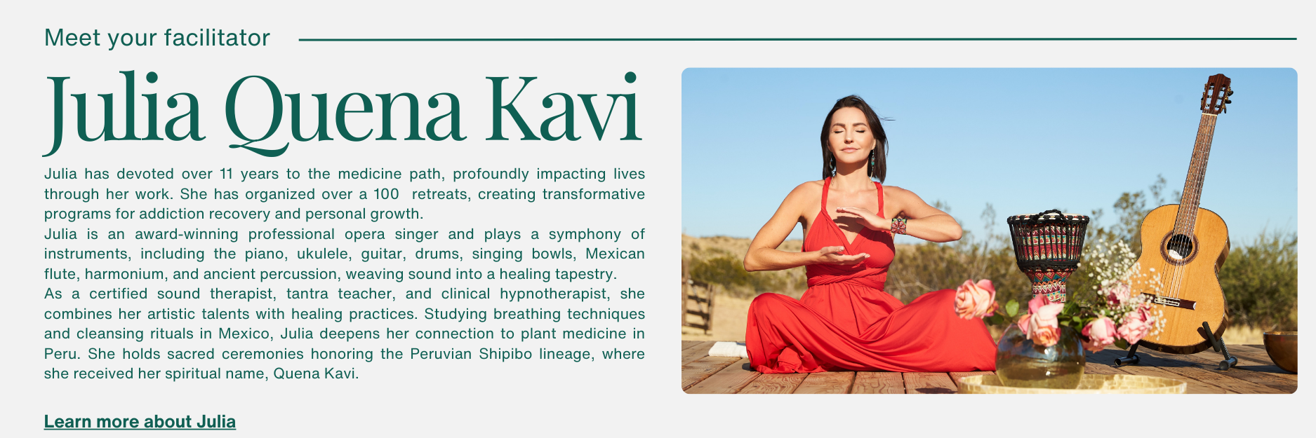 "My mind slowed down along with my heartbeat. I felt seen, heard, and understood. I also felt adventurous about the activities, since there were many new things for me and I enjoyed them a lot. Julia is a wonderful holder of the space for people, she makes people feel safe to open up their true selves, without any judgment. That’s where the transformation happens. It made me feel that I’m already enough, just the way I am."